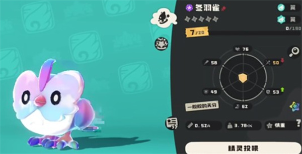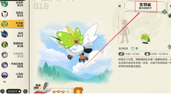 冬羽雀是典型的翼属性精灵,身高约0.66米,体重10.64千克。根据季节变化,它会出现春、夏、秋、冬四种形态,但这些仅为外观差异,属性数值并不会变化。
