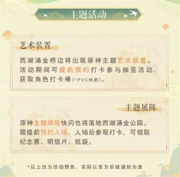 活动期间,涌金桥旁将设置大型原神主题艺术装置,玩家可现场预约打卡并参与抽签,有机会获得限量发放的 角色打卡棒(PVC材质),集齐七国元素主题设计。