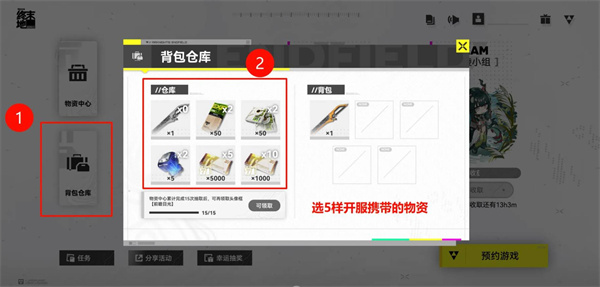 在完成预抽卡后,需要进入活动页面左侧的背包界面,手动勾选5件物资作为开服携带内容。未被选中的道具将无法带入游戏。>>活动入口<<