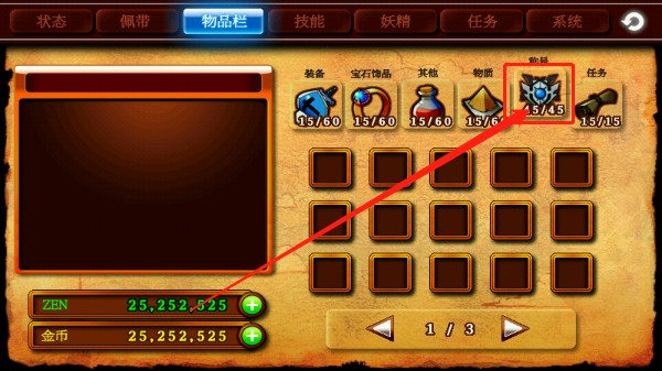 MISC,药品,其实很杂,回复药(POTION)、强化用的材料、精灵出来的符文石(RUNE)和技能石(SKILL STONE)都在这里MATERIAL,材料,即合成用的材料。