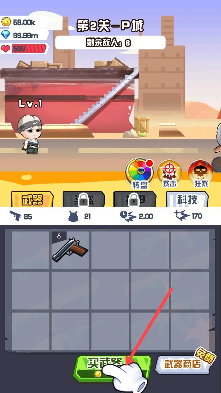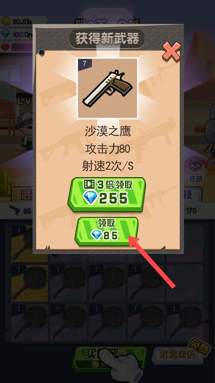 2、玩家在打怪过程中获得金币后,玩家根据自己的游戏策略和金币数量,选择合适的武器进行购买,获得新武器后可以领取钻石。
