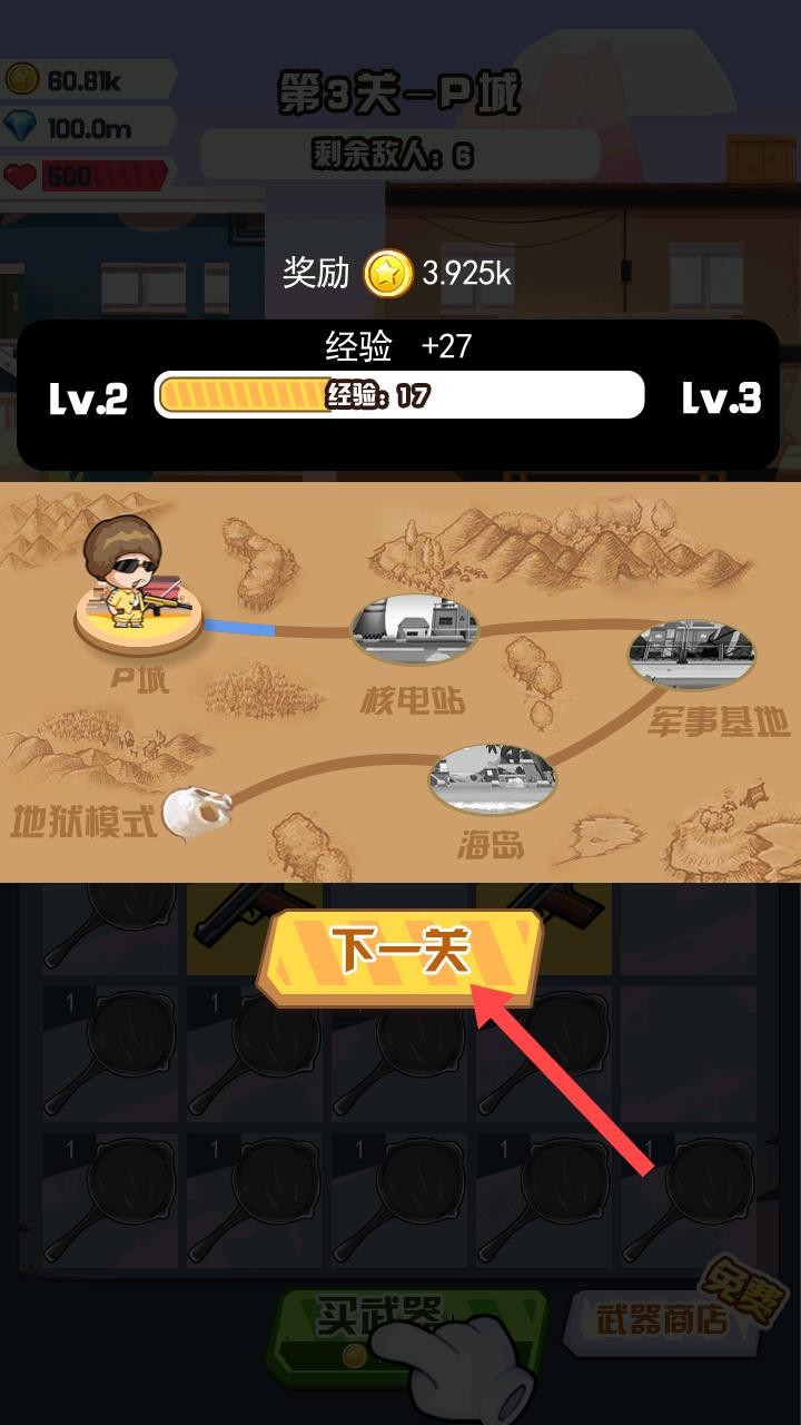 3、玩家操控角色在游戏场景中击败所有怪物,完成关卡任务后,游戏界面会显示通关成功的提示,点击下一关。