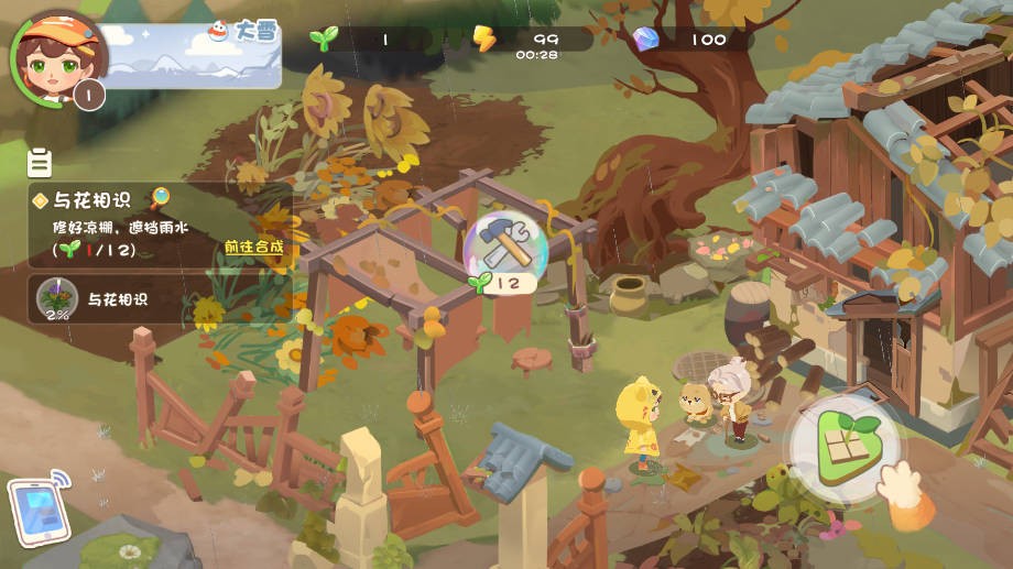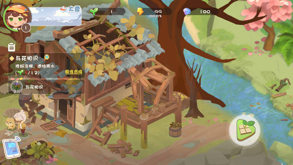 3、通过合成系统制作更高级的物品,收集树叶资源,玩家可以用来改造池塘、修复汽车和重建房屋,有效降低碳排放水平。
