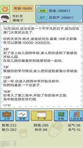 1、看你的初始属性:魅力高适合“社交路线”,智力高可优先科技研发、炒股,体力高可先当蓝领攒第一桶金。