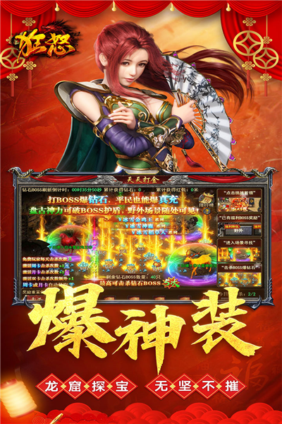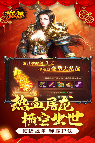 狂怒新人进服,小秘送真充,领取免费周卡,狂怒副本一键扫荡!收服冰雪魔晶蝎,辅助麻痹,杀怪以一当百。进入练功房自动打坐,泡点经验直升百级。冲击跨服巅峰赛,勇夺赛季冠军,穿戴王者剑甲!