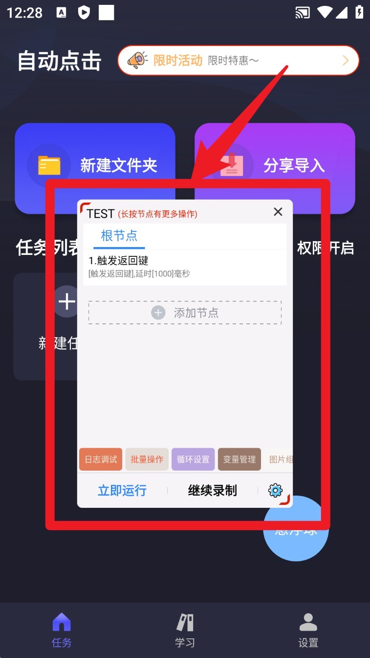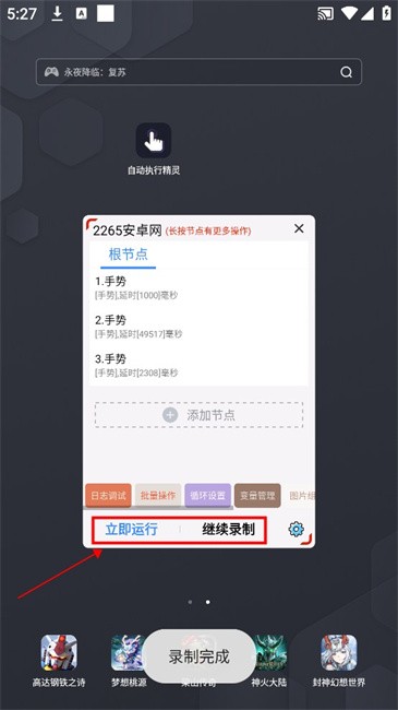 5、创建完成后,点击节点设置参数如延时、循环等,然后可选择立即执行或继续录制。