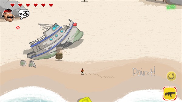 2、玩家被大海冲上沙滩,通过点击屏幕右侧的“枪械”开火和“圆形按钮”翻滚,通过长按屏幕也可以做到“按住哪里打哪里”的效果,角色血条和命数都在屏幕左上角可见。