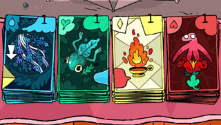 玩家所扮演的是一名出售药水的商人,你要根据客户的需求来配置药水。可以看到画面的下方有四种颜色的卡牌,分别是红、黄、蓝、绿,每一次配置药水需要放置四张卡牌在中间的卡槽内,至于放置的先后和左右顺序玩家可以自行决定。