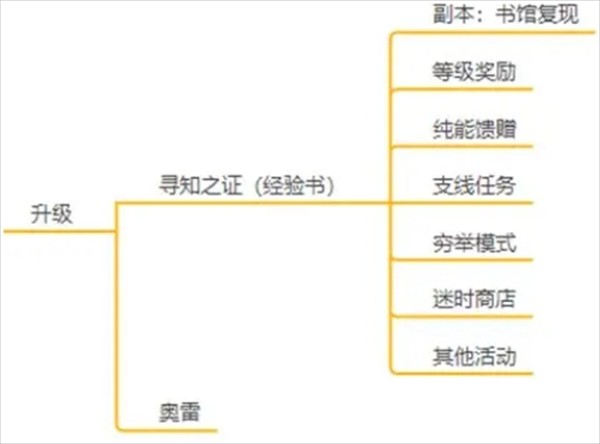 升级主要是通过蓝色、紫色、金色三个等级的寻知之证(经验书)来进行,寻知之证可供获取的途径如下图所示: