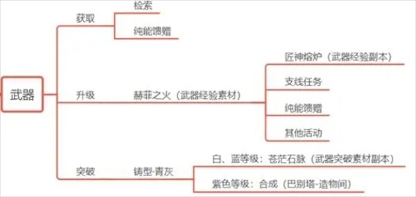 高等级武器可以通过检索或纯能馈赠30级获取,升级和突破素材的获取途径如下:
