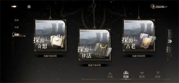 技能需要通过技能经验书来提升,不同角色所对应的技能书种类不同,可以根据角色需要,从资源-技能副本去选择对应的探源副本战斗,以获取相应的技能经验书。
