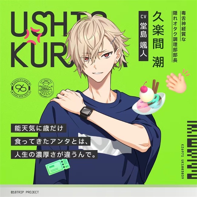 久乐间潮是HAMA9区长,滨明日桧高中二年级学生,烹饪部部长。性格毒舌神经质,是隐藏的阿宅,但制作的巧克力点心非常美味。除了发小8区长宗氏外,从未对任何人打开过心房。生日为3月10日,年龄16岁,身高175cm,属于Day2队伍。由堂岛飒人配音。