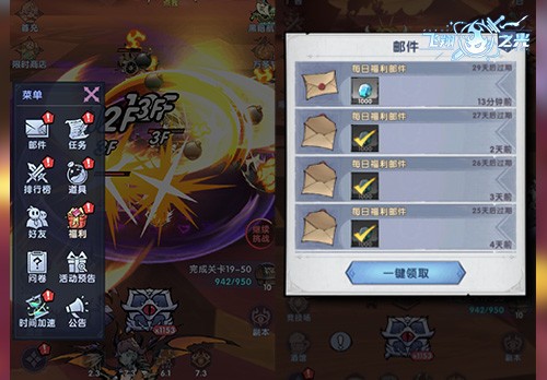 第一件事是“领”。每天打开《飞翔之光》以后,一定要先把离线收益、签到奖励、每日奖励、邮件福利统统领好。