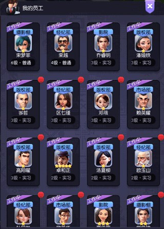 员工分为:1-5星,摄影棚-市场部-版权部-经纪人-影院(总裁办公室和星探无法直接招募)