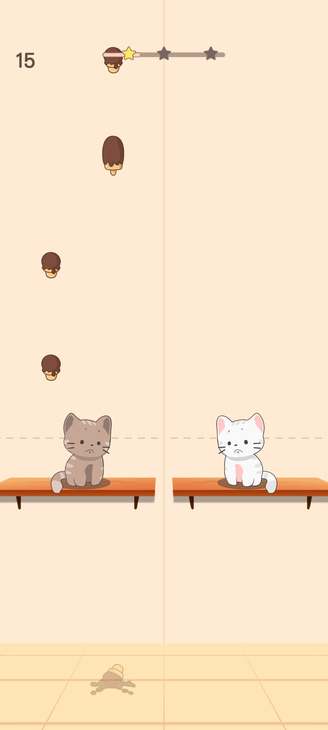 3、在猫咪二重唱游戏中玩家需要点击屏幕让两只猫咪吃到事食物,食物是不可以掉落的;