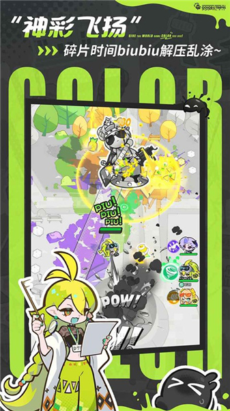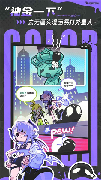 乱涂彩世界手游为一款潮酷无厘头的涂色解压弹幕射击游戏,玩家在乱涂彩世界手游中将化身为一名“打工恶魔”,为了抵抗外星人入侵,你需要与不靠谱神明组成“染色小分队”,然后拿起染色武器,为地球找回失去的颜色。
