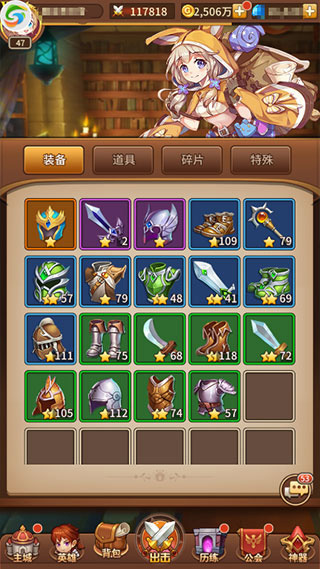 集齐失落在冒险大陆的各种神器后就能进行神器培养了,经过培养的神器将在战斗中提供属性加成,不同的神器还有各自专属的神器技能,让你轻松获得战斗胜利。