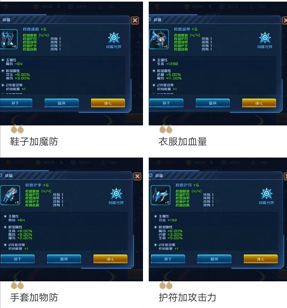 装备主属性分四种,每个装备部件对应的主属性见上图,装备等级越高,加的属性数值也就越多。