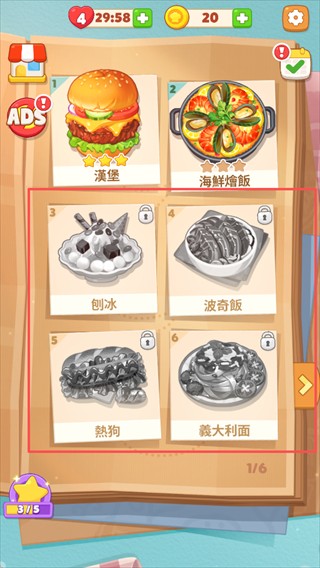 1、进入游戏后,你会发现有多个关卡,但它们需要逐步解锁。首先,你将能够制作已解锁的菜品,如汉堡和海鲜烩饭等,随着游戏的进展,更多创意食谱将等待你解锁。