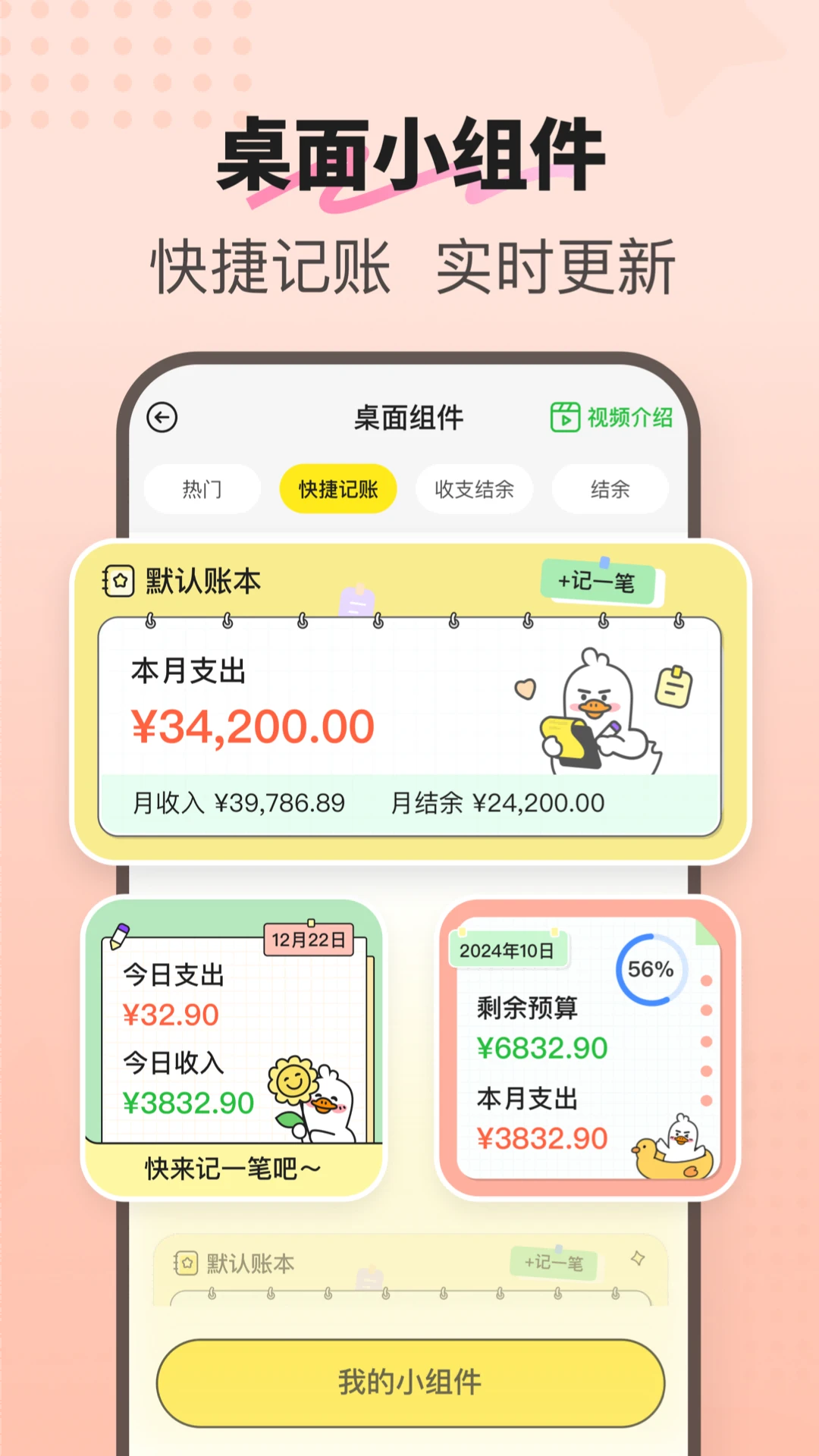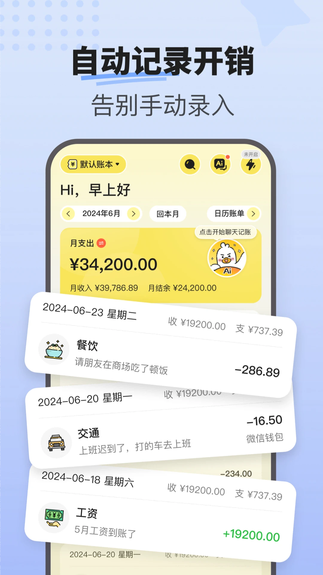 飞鸭记账(财务管理)app是创新式的智能记账工具。飞鸭记账app结合AI聊天陪伴、自动记账、消费分析、预算提醒等功能,让用户在与爱豆互动的同时轻松管理个人财务。软件支持微信、支付宝、淘宝等付款场景自动记录,确保账单分类精准、记账流程高效。