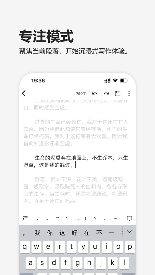 4、专注模式通过段落聚焦屏蔽干扰,提升写作效率和创作体验。