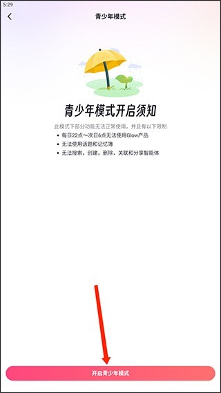 3、打开后,在最下方点击【开启青少年模式】即可完成设置。