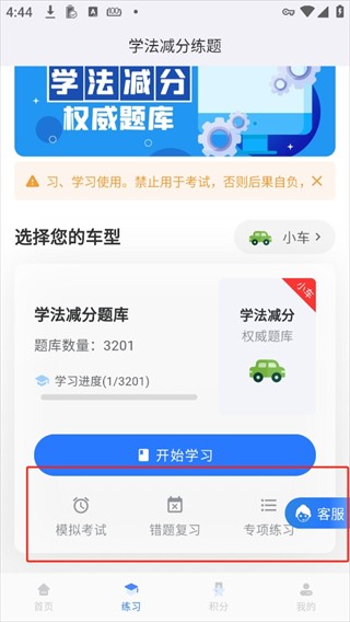 5、这里提供模拟考试、错题复习、专项练习点击开始学习。