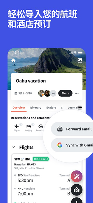 4、应用中集成了航班、酒店和景点信息,用户可以直接导入确认邮件或通过Gmail自动添加。