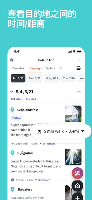 1、支持在地图上查看、重新安排行程顺序、添加笔记和链接,以及自动同步行程轨迹。