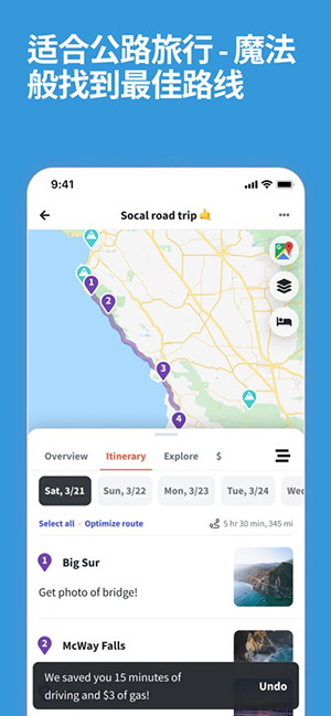- 计划自驾游?免费添加无限停靠点,优化旅游路线,查看地点之间的时间和距离,并将地点导出到Google Maps。