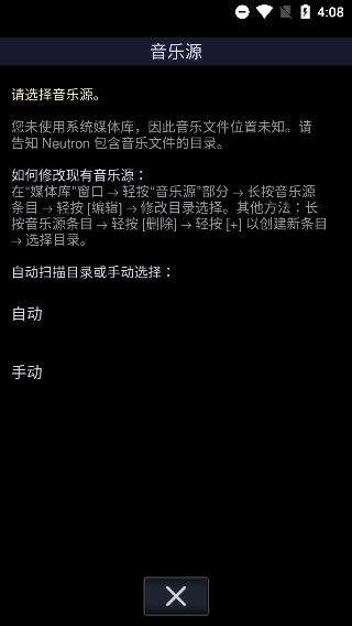 1、从 Sources 部分删除现有的源条目,并使用 Google 的新 Scoped File Access (SAF) API 创建新的源条目,这是访问应用程序用户文件的唯一可能性。为此,您需要: Sources -> [+] -> File System -> [+] -> 在操作系统选择对话框中选择音乐文件夹 -> 一旦您确认,此文件夹将被添加到 Neutron 的文件系统列表中。之后,您可以点击此条目浏览并选择要扫描的文件夹,也可以直接选择允许的文件夹并确认扫描。请记住,SAF 比通用文件访问慢 10 倍,这是由于 Google 的糟糕实施造成的。