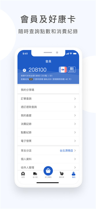 3、注册后可在家乐福app内绑定实体会员卡或直接生成电子会员卡使用。