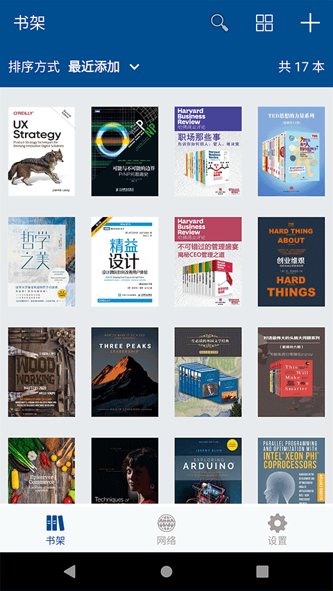 提供清晰的书架界面,用户可列表或网格方式浏览图书、查看简介、添加标签、标记已读。