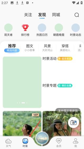 2、点击时景页面,分关注、发现等板块,含观天者、排行榜等分类,可浏览风景等图文内容。