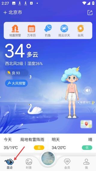 1、点击墨迹天气精准版首页,定位北京,显示34度多云,有大风预警,提供地震预警等附加功能入口。