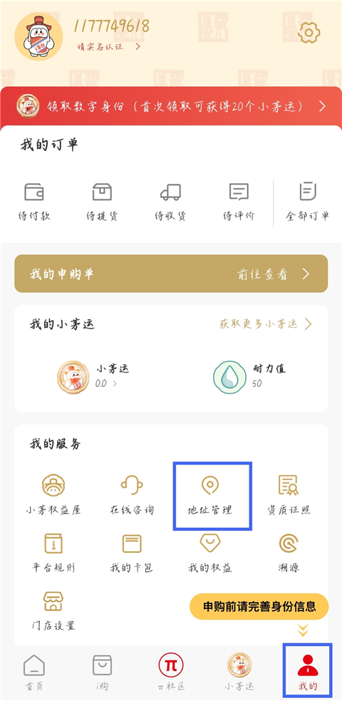 1、打开i茅台app,进入【我的】主页,点击【地址管理】。