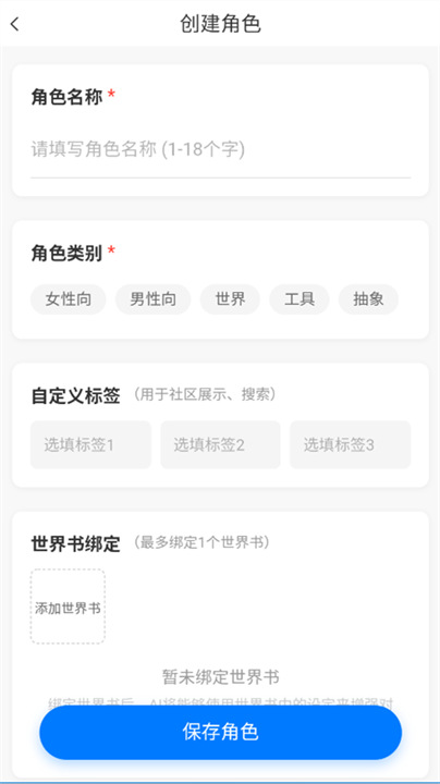 【自定义设定】用户可创建并编辑角色信息,定义语气、职业与性格特征。