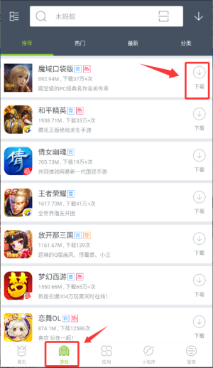 2、进入游戏板块浏览魔域口袋版等各类游戏资源。