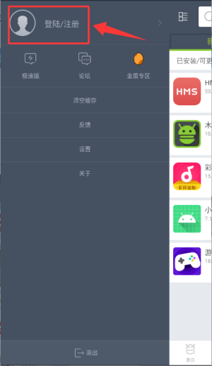 1、打开木蚂蚁软件园手游中心,点击左上角的按钮,选择“登录/注册”。