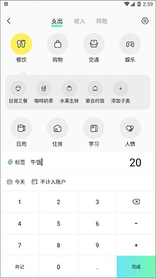 记账时你可以选择支出、收入、转账,每种板块下都有丰富的分类,每个分类还有许多子类可以选择,输入备注和金额后,再选择日期,最后点击“完成”即可。