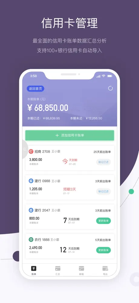覆盖现金、微信、支付宝、信用卡等主流账户,支持100+银行信用卡账单管理,自动追踪各账户消费记录。