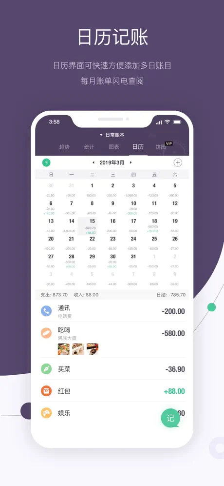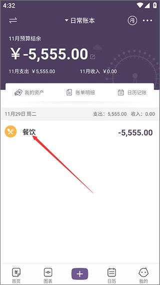 3、日历:在这里根据日历进行记账,让你快速知道每一天的消费情况。