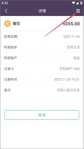 2、点击查看账单详情,点击页面右上角的删除图标。