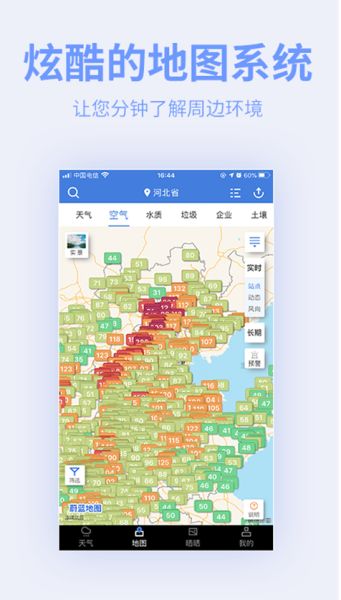 2、非常炫酷的地图系统,打开这个污染指数地图就可以看到全国各个城市的污染指数,让你能够通过地图了解污染情况