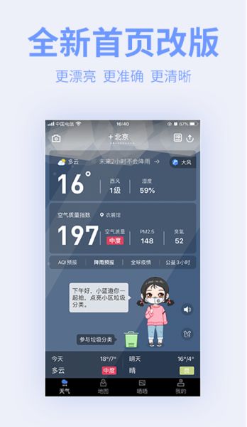 1、点击进入蔚蓝地图精准版,会自动定位所在城市,并显示天气和空气质量的基本信息。
