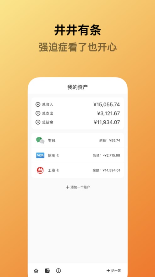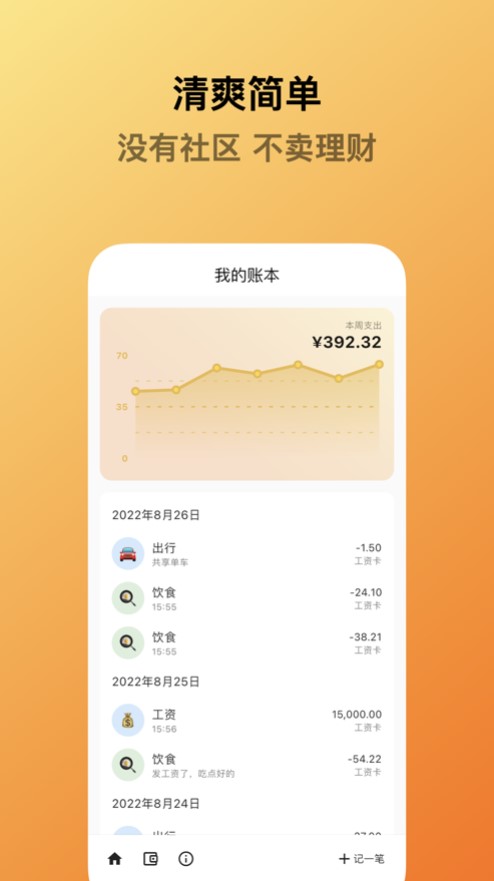 4、界面清爽简洁,无需注册登录就能直接使用;没有社区功能,也没有烦人的红点提示,能让人专注于记账这件事。