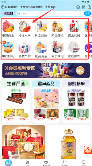 1、打开盒马鲜生超市客户端后,可在首页选择果蔬或水产等分类浏览商品。