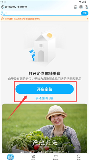 1、下载安装并打开盒马鲜生超市客户端,首先点击左上角地址栏。