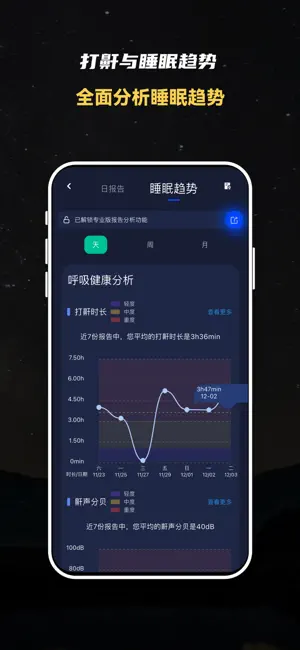 作为你的枕边睡眠伴侣应用,我们也会帮助你了解更多你的睡眠习惯,捕捉你在睡眠过程中的梦话以及呼噜(鼾声)。