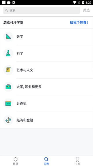 2、探索界面可以选择具体学习科目数学、科学、艺术与人文、计算机、经济和金融等